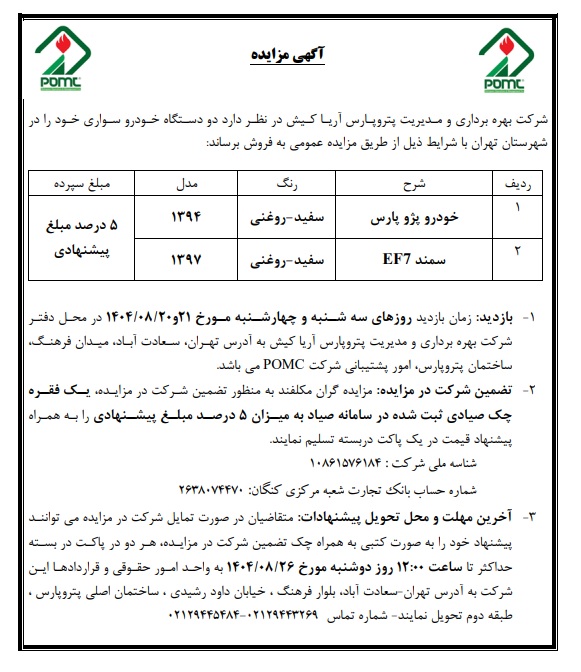 آگهی مزایده| شرکت بهره برداری و مدیریت پتروپارس آریا کیش دو دستگاه خودروی سواری را به مزایده گذاشت